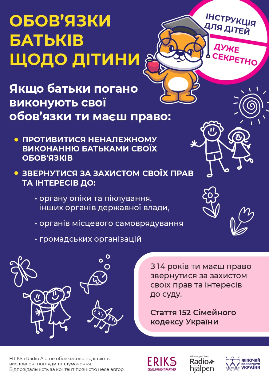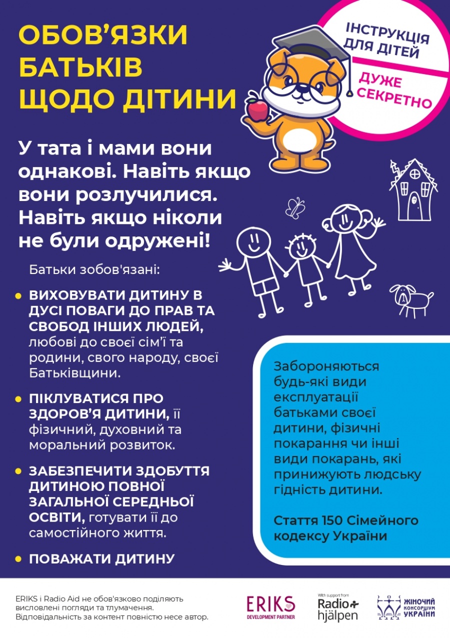 Інформкампанія проводиться у межах проєкту «Допомога, відновлення, відбудова заради дітей в Україні. Частина-ІІ», що профінансований ERIKS Development Partner та Radio Aid (Швеція). ERIKS і Radio Aid не обов'язково поділяють висловлені погляди та тлумачення. Відповідальність за контент повністю несе автор.