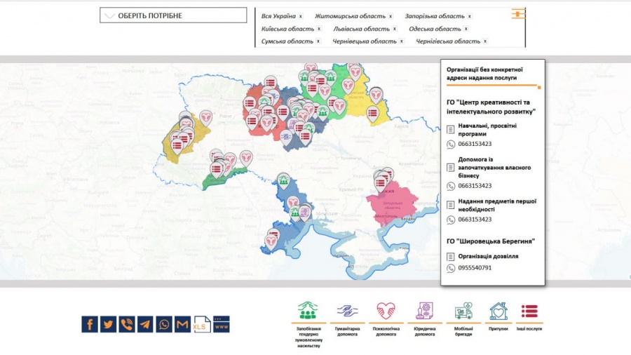 Нагадуємо, КАРТУ ПОСЛУГ, БАЗИ ОРГАНІЗАЦІЙ із запобігання та реагування на гендерно зумовлене насильство, психологічної, юридичної, соціальної, гуманітарної допомоги для жінок і дівчат Київського, Житомирського, Чернігівського, Сумського, Львівського, Чернівецького, Одеського, Запорізького регіонів створила команда Жіночого консорціуму України за підтримки Міжнародного медичного корпусу та фінансування USAID.