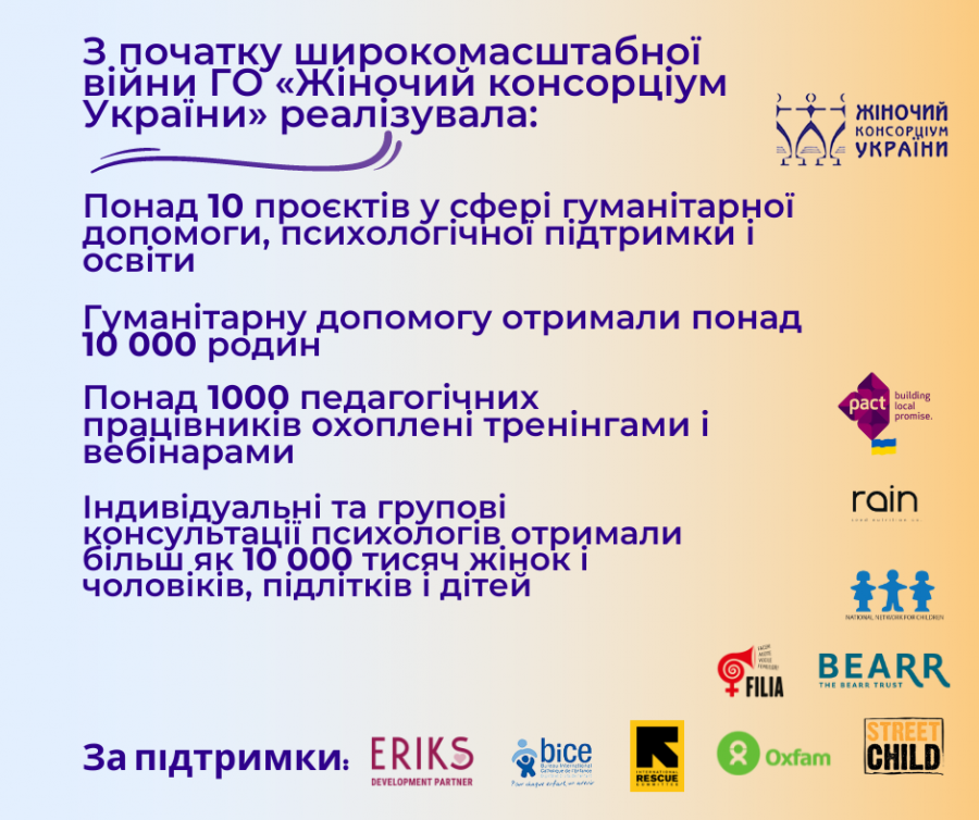 Безумовно, це все було б неможливим без підтримки міжнародних донорів: OXFAM, IRC, STREET CHILD, BICE, Rain International, Centrul FILIA, The Bearr Trust, Eriks Development Partner, National Network for Children, Pact та інших. І сьогодні ми, ГО «Жіночий консорціум України» і партнерські організації ЖКУ, щиро дякуємо їм! За допомогу, розуміння і підтримку українців. За швидке реагування на запити і за те, що просто по-людськи постійно переживали за нашу безпеку. Усе ваше тепло і допомогу ми несли українцям. Дякуємо за все!